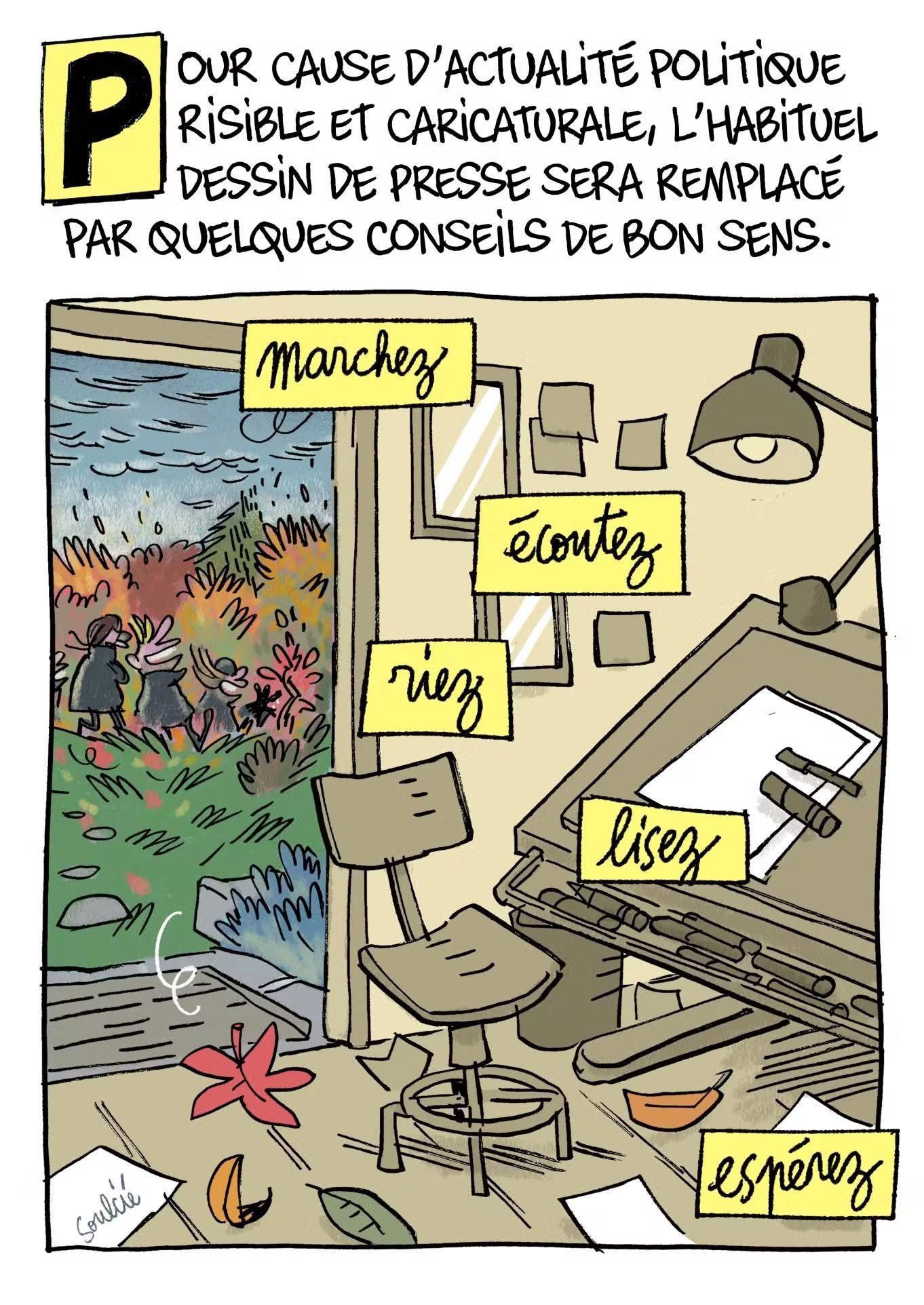 Mais aussi « marchez, écoutez, lisez, riez et espérez » comme nous le recommande Soulcié dans son illustration avec talent. Je crois que je ne pouvais pas rêver meilleure ouverture et meilleure coda à cette nouvelle tribune.