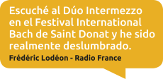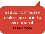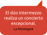 Marielle Gars al piano y Sébastien Authemayou al bandoneón transmitieron con tanta pasión su apego al compositor argentino, fundador del tango nuevo Astor Piazzolla y a su obra, que el Dúo Intermezzo no estaba compuesto por dos músicos, ¡sino por tres! […] Los dos músicos revisitan el tango y le dan, a través de sus arreglos, una nota actual respetando la dramaturgia del tango. […] Música alegre y nostálgica, el tango argentino nuevo ha encontrado con el Dúo Intermezzo herederos y transmisores dignos de su padre.